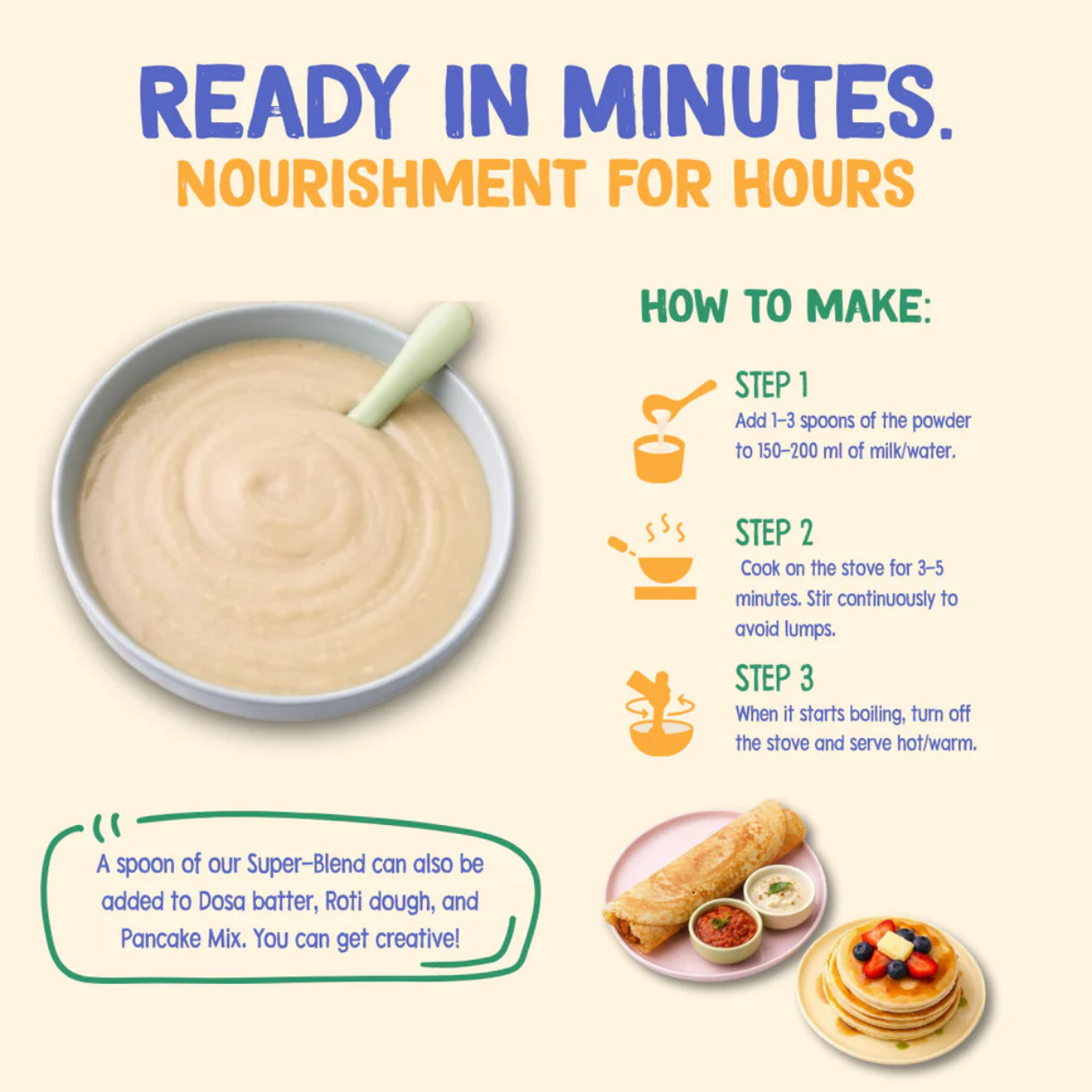Just add 2 spoons to milk or water and cook for 2 minutes—your healthy breakfast mix is ready.